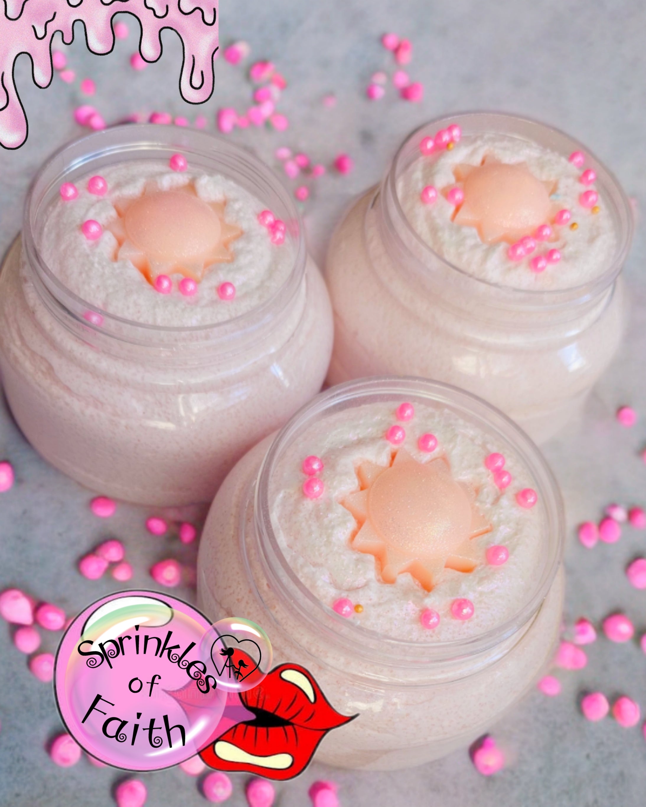 Ingredients: Sugar (Sucrose), Refined Shea Butter (Butyrospermum Parkii), Sweet Almond Oil (Prunus Amygdalus Dulcis), Vitamin E Oil (Tocopherol), Glycerin, Fragrance, Mica.