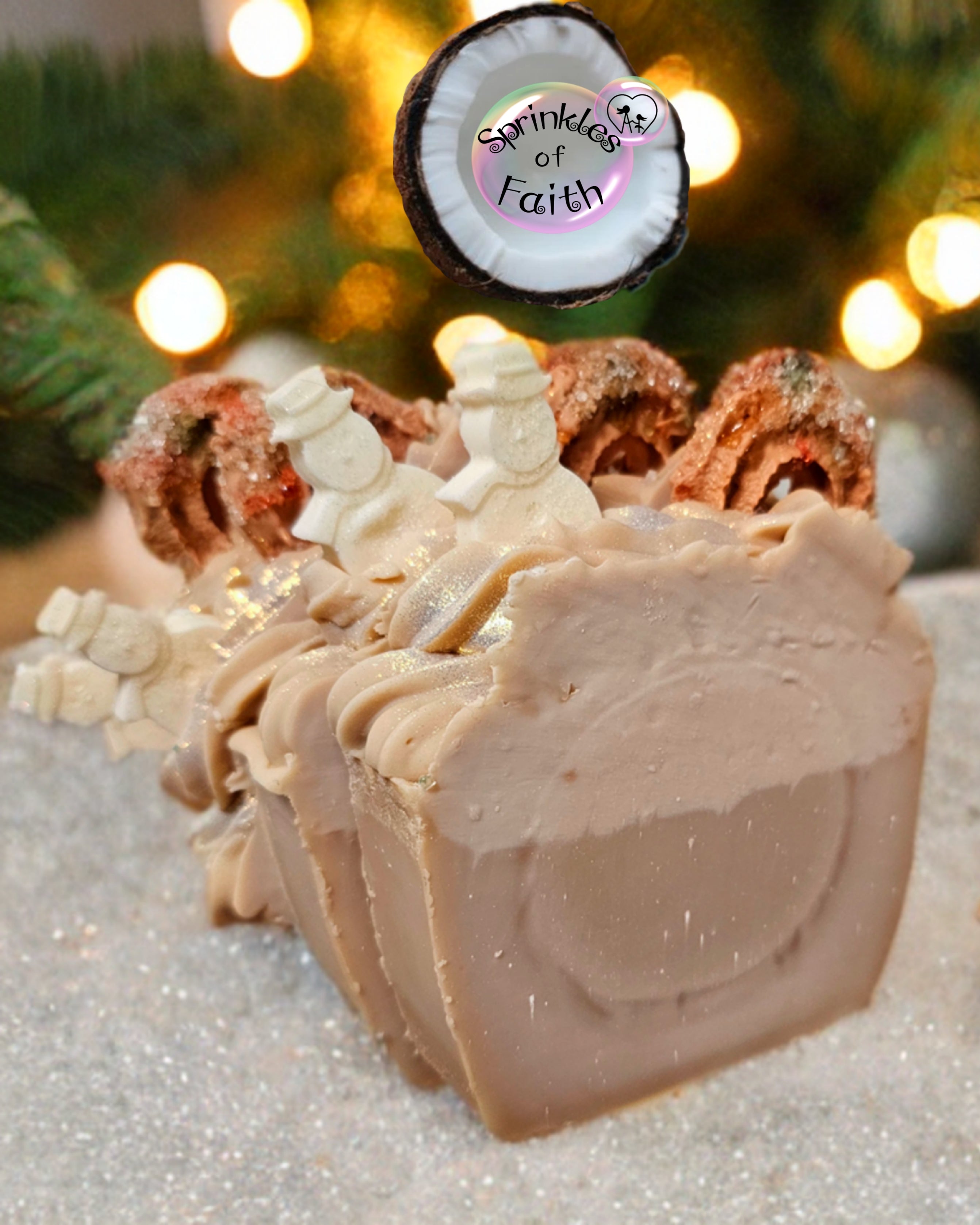 Get ready for a festive treat with Coconut Sugar Frost at Sprinkles of Faith! This handcrafted soap is the perfect mix of holiday cheer and tropical bliss. Adorned with a cute snowman and a glittering sugar cookie on top, it’s as delightful to look at as it is to use.