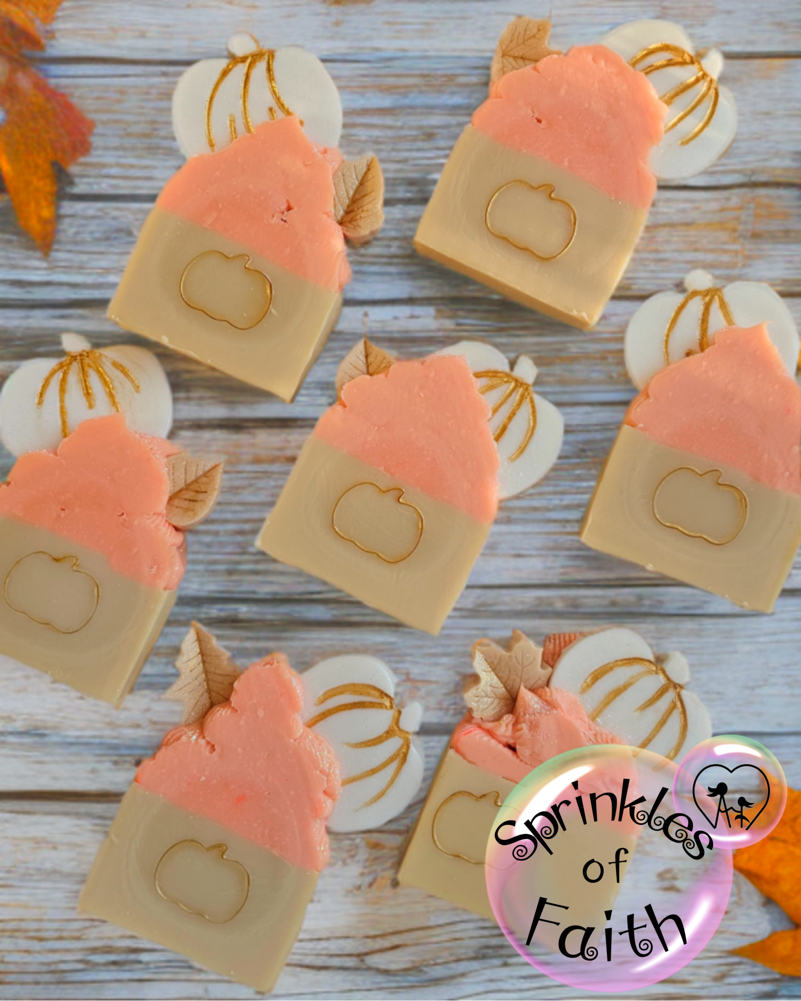 This handmade soap, featured in a delightful autumn theme, is a multi-layered creation with visually appealing details. The top portion is a soft peachy-orange, resembling a whipped frosting-like texture, while the bottom half is a neutral beige tone, possibly reflecting warm, cozy hues for fall. Embellished with gold accents, including pumpkin shapes and detailed leaves, the soap carries a festive and rustic aesthetic.