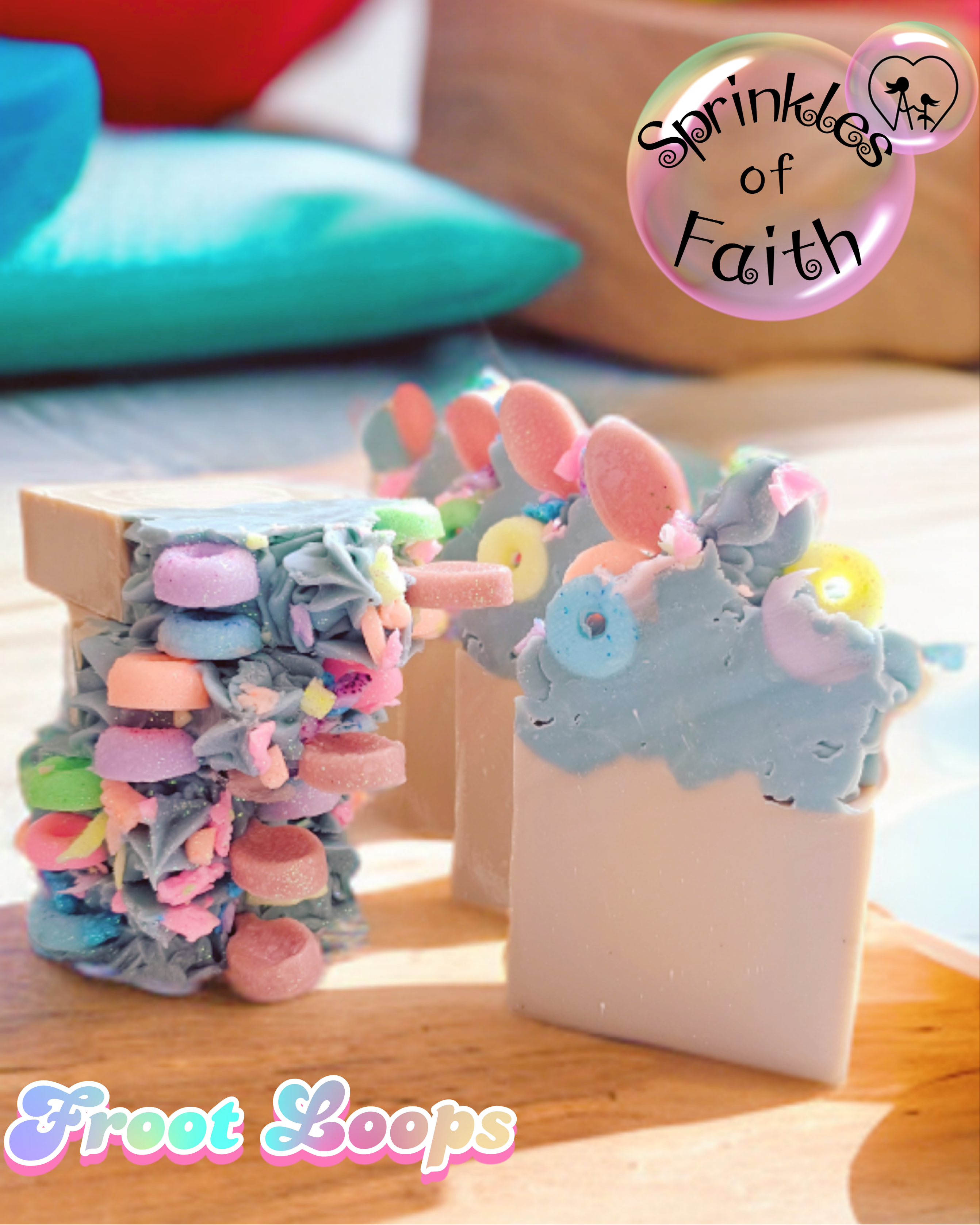 Imagine a handmade soap bursting with vibrant energy, scented like a fresh bowl of Froot Loops. The top notes of zesty lemon rinds, lime, and bright grapefruit hit your senses first, creating a playful, citrusy experience that mimics the iconic fruity loops. As you lather, the scent evolves with a heart of lemongrass, soft lily, and refreshing verbena, adding a subtle floral touch that balances the initial burst of fruitiness.