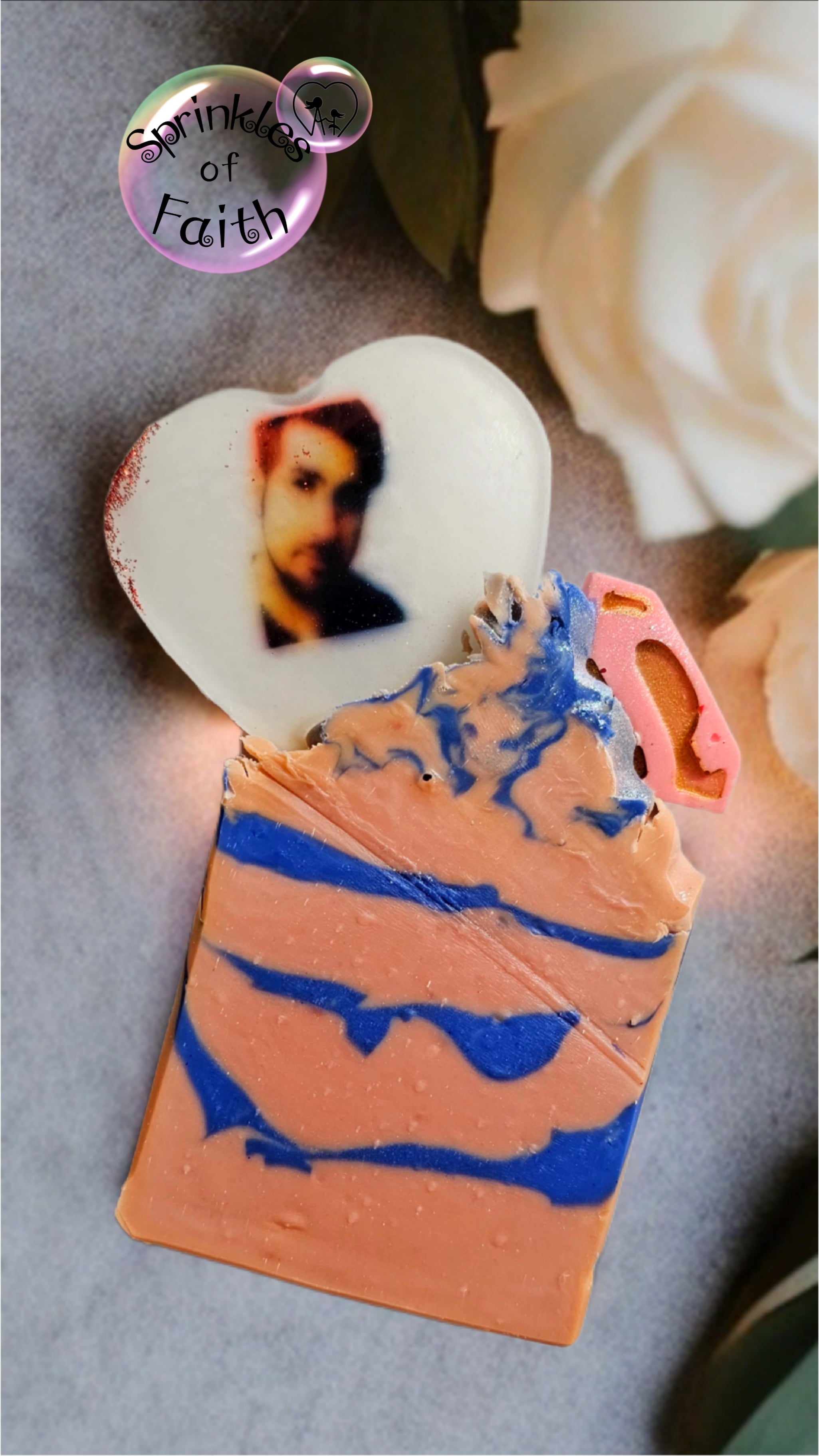 This playful and bold bar combines a burst of vibrant red and blue swirls, topped with a heart that adds a personal, loving touch. A subtle charm of a mini superhero emblem completes the design, making this soap a standout addition to your collection.